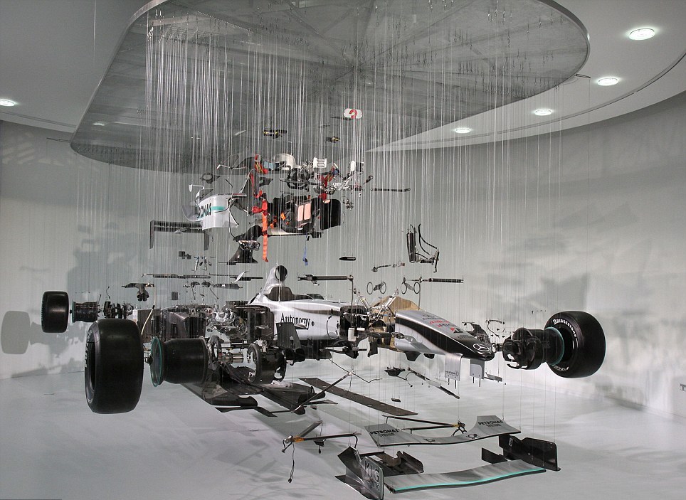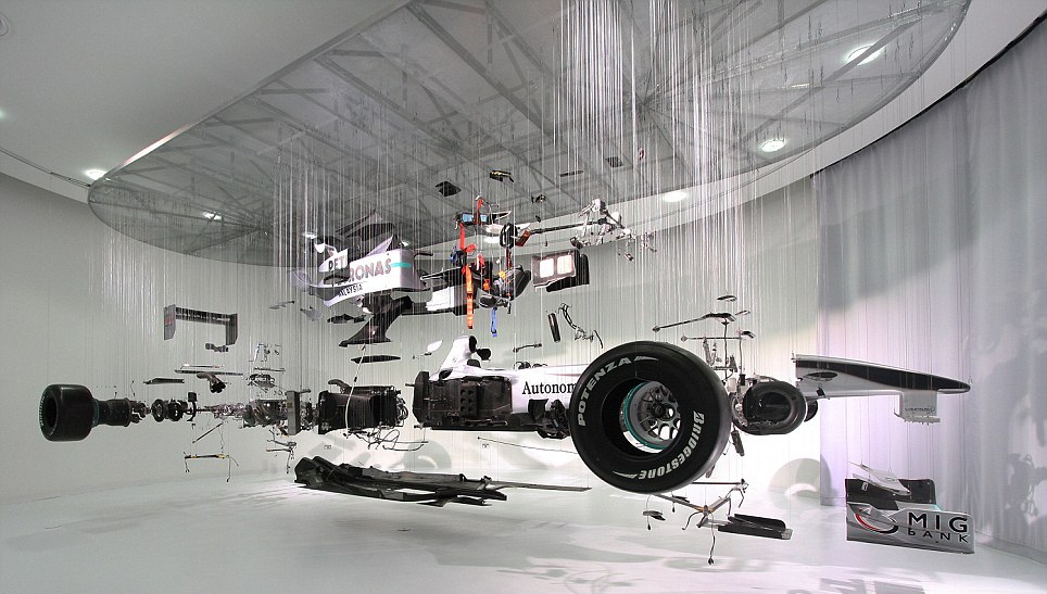 Το καμάρι της Formula 1, που έχει οδηγήσει ο επτά φορές παγκόσμιος πρωταθλητή Μίκαελ Σουμάχερ, η MGP W01 της Mercedes, αξίας 30 εκατ. λιρών κρέμεται πλέον από το ταβάνι μιας γκαλερί…